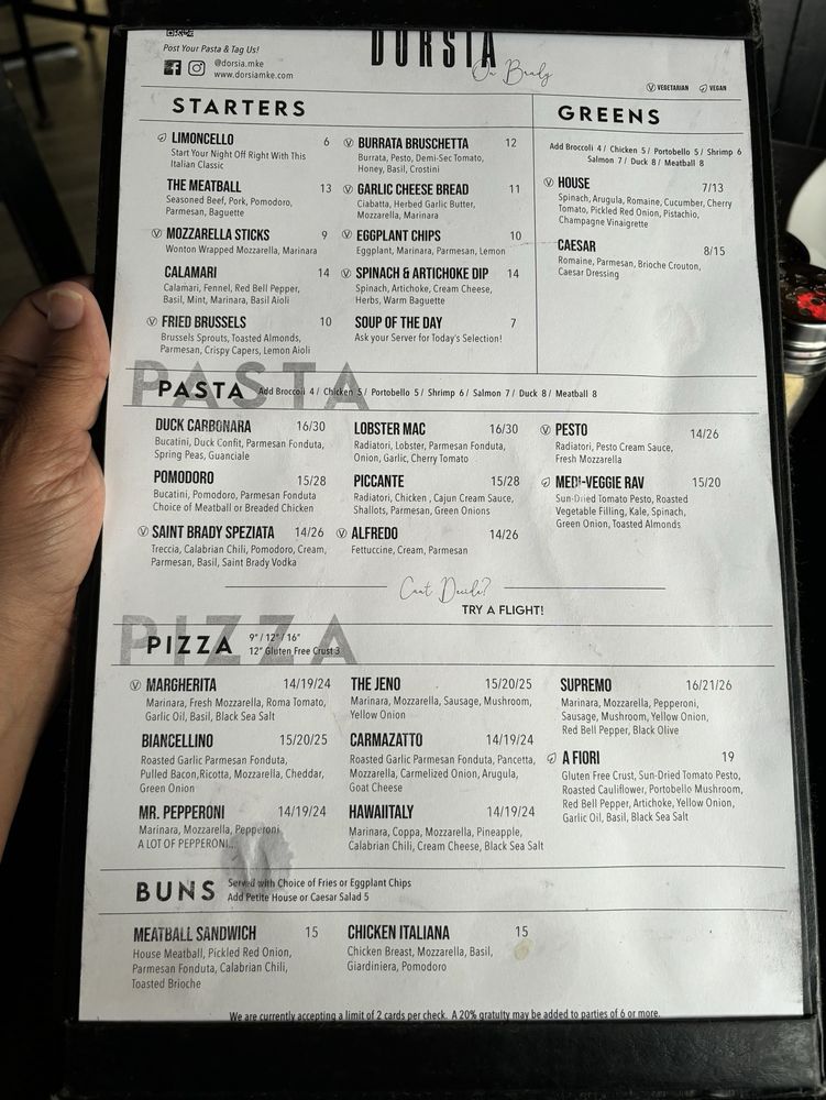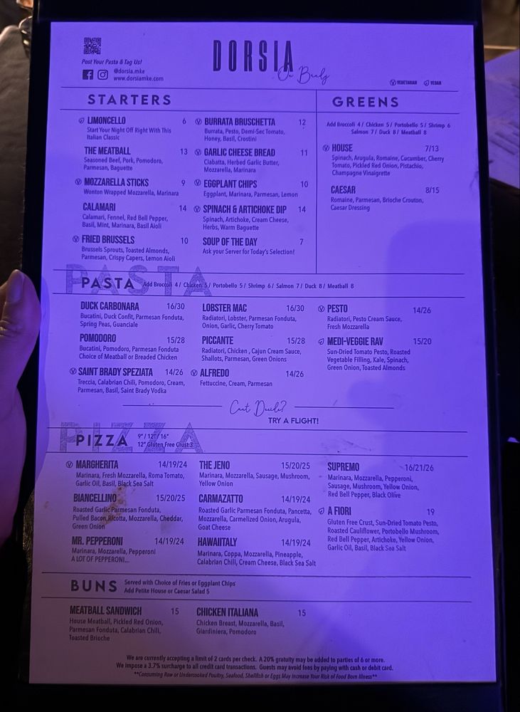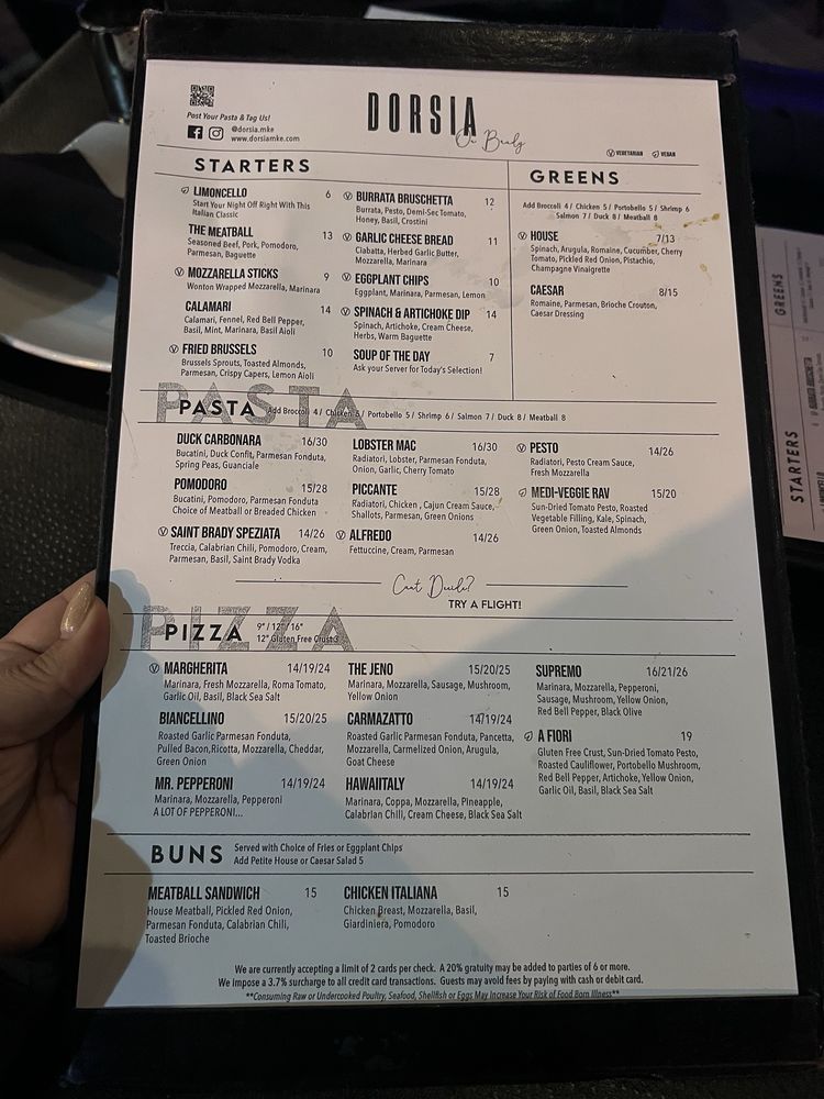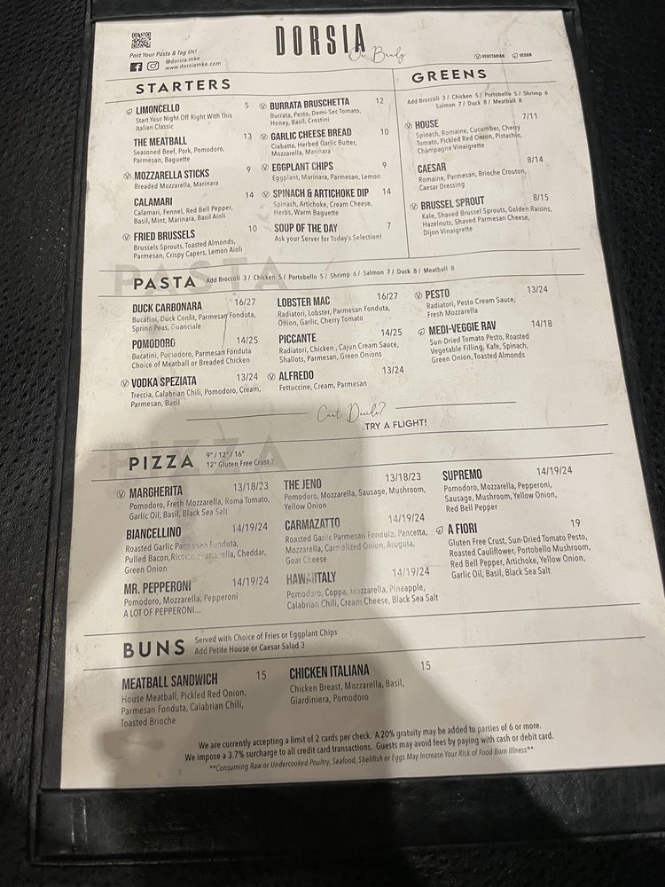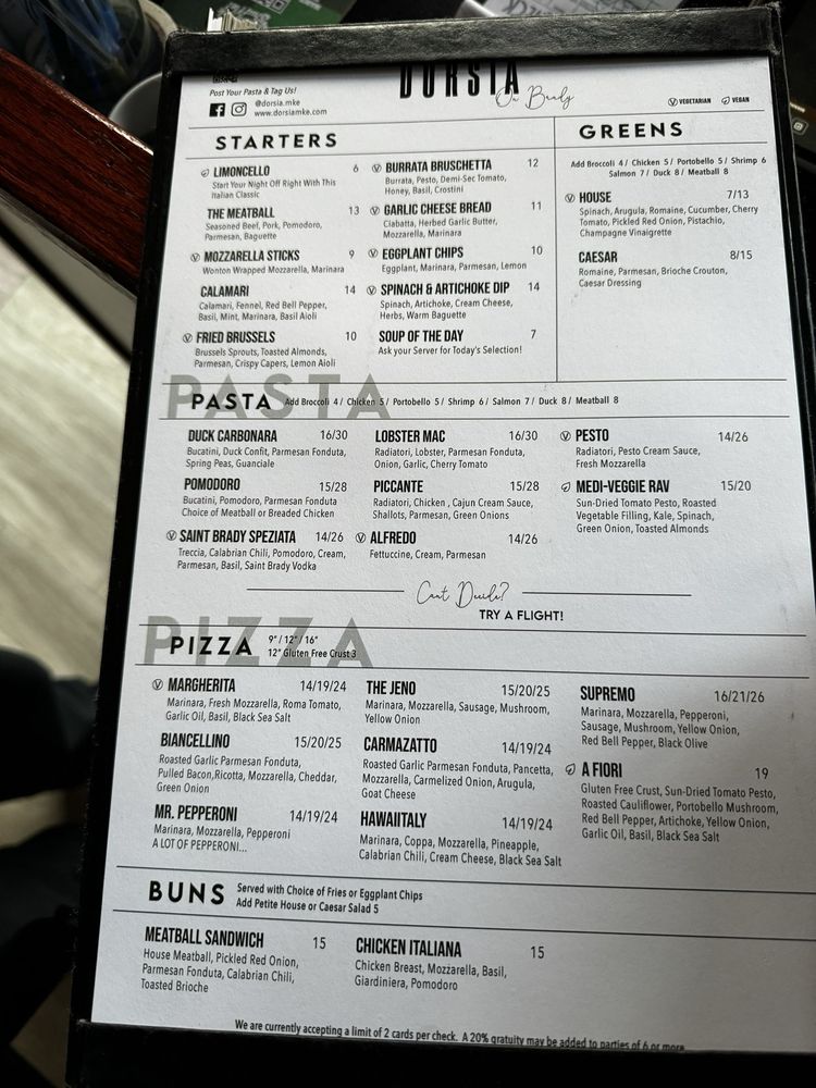 Dorsia on Brady Street in Milwaukee is a trendy Italian bar known for its pasta flights. With a modern and elevated aesthetic, Dorsia offers a unique dining experience with options for vegan and vegetarian guests. The menu features dishes like calamari with marinara and pesto cream sauces, Pomodoro pasta, and the supremo pizza. Customers rave about the flavors of the pasta flight, including options like Duck Carbonara and Saint Brady Speziata. The ambiance is swanky, with candles adding to the vibe, making it a perfect spot for a date night or special occasion. The attentive waitstaff, led by servers like Jaden, ensure a memorable dining experience. From the delicious food to the vibrant atmosphere, Dorsia is a must-visit for pasta lovers seeking a unique culinary adventure.