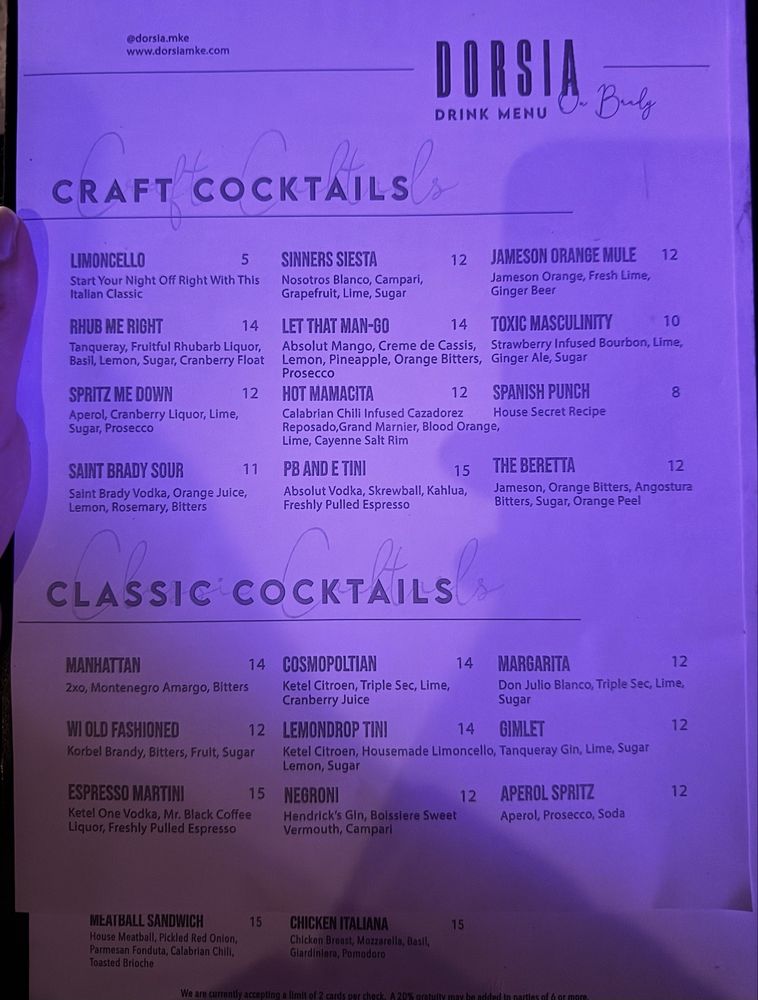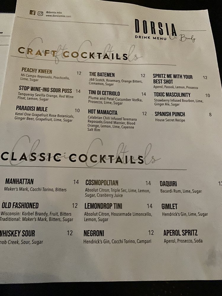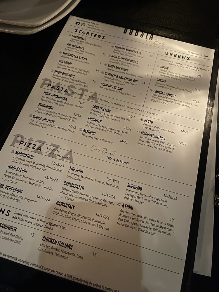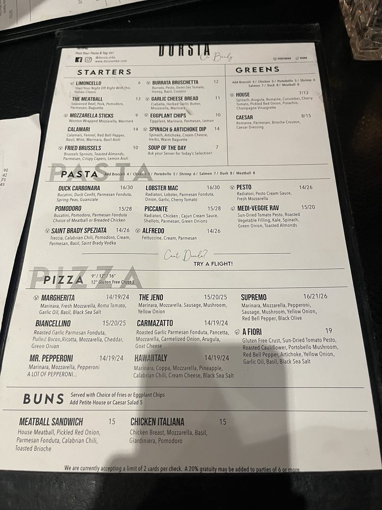 Dorsia on Brady Street in Milwaukee is a trendy Italian bar known for its pasta flights. With a modern and elevated aesthetic, Dorsia offers a unique dining experience with options for vegan and vegetarian guests. The menu features dishes like calamari with marinara and pesto cream sauces, Pomodoro pasta, and the supremo pizza. Customers rave about the flavors of the pasta flight, including options like Duck Carbonara and Saint Brady Speziata. The ambiance is swanky, with candles adding to the vibe, making it a perfect spot for a date night or special occasion. The attentive waitstaff, led by servers like Jaden, ensure a memorable dining experience. From the delicious food to the vibrant atmosphere, Dorsia is a must-visit for pasta lovers seeking a unique culinary adventure.